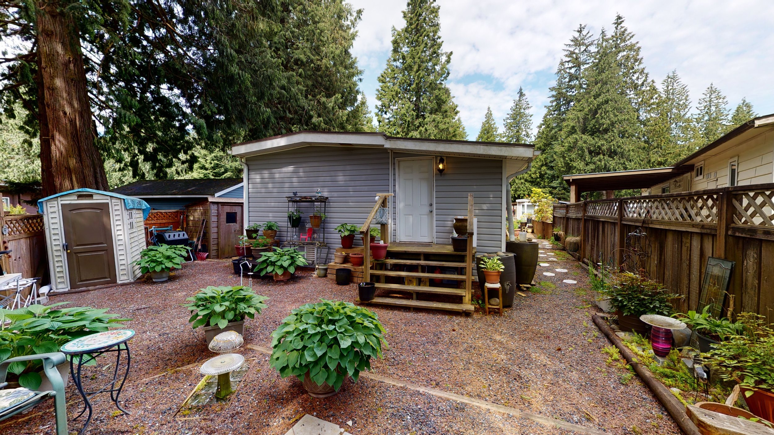 The pad is low maintenance with rock paths, large stone sitting spaces, and backs onto the community park and playground.